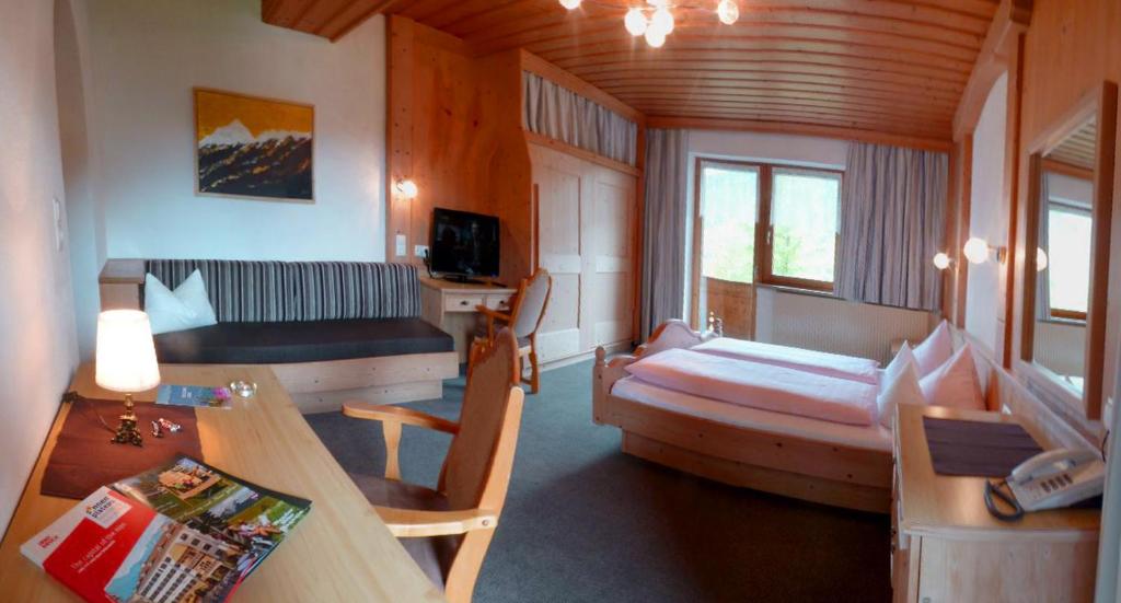Die Innenräume des Alpenhof sind ein typisches Alpenhaus. Im Wohnbereich der Pension erwartet Sie ein großer Kachelofen, wo Sie nachmittags kostenfrei Tee und Kaffee genießen können. Der große Garten bietet einen Grillplatz und Sonnenliegen.