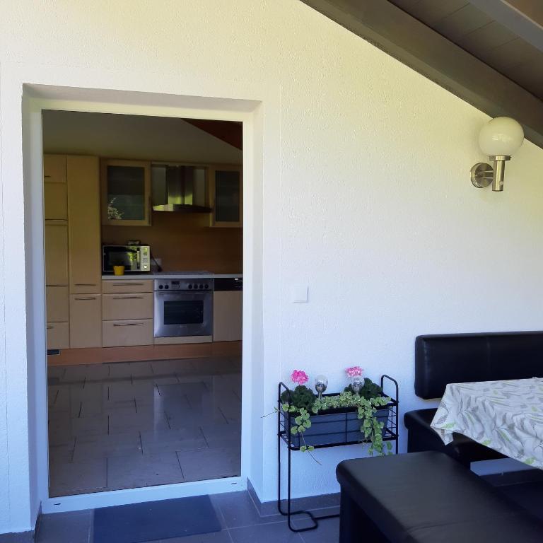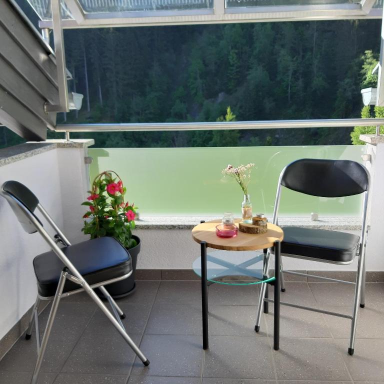 Das Appartement verfügt über 2 Zimmer, von denen jedes über einen eigenen Balkon verfügt und damit einen schönen Blick auf die Berge oder den Garten gewährt. Über den großzügig ausgestalteten Wohnraum mit gemütlicher TV- und Chillecke, Essbereich und integrierter Küche gelangen Sie auf die einladende Dachterrasse, wo Sie den Tag mit einem guten Glas Wein ausklingen lassen können. Die komplett ausgestattete Küche verfügt über einem Geschirrspüler, eine Mikrowelle, eine vollautomatische Kaffeemaschine und zusätzliche Sitzgelegenheit. Ein Badezimmer, ausgestattet mit Eckbadewanne, Dusche, Bidet und WC, sowie einen zusätzlichen Gäste-WC, machen dieses Feriendomizil komplett. Parkplatz und Wlan- Nutzung sind kostenfrei.