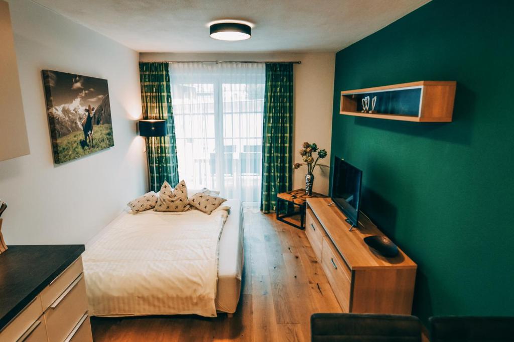Das Apartment verfügt über 1 Schlafzimmer, 1 Badezimmer, Bettwäsche, Handtücher, einen Flachbild-Sat-TV, einen Essbereich, eine voll ausgestattete Küchenzeile und eine Terrasse mit Bergblick.