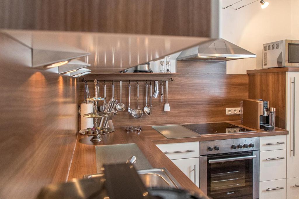 Jedes Apartment ist mit einer voll ausgestatteten Küche mit Geschirrspüler und Mikrowelle eingerichtet. Im großen Wohnzimmer ist der Ess- und der Wohnbereich getrennt. Die Zimmer sind geräumig und mit traditionellen Holzmöbeln ausgestattet.