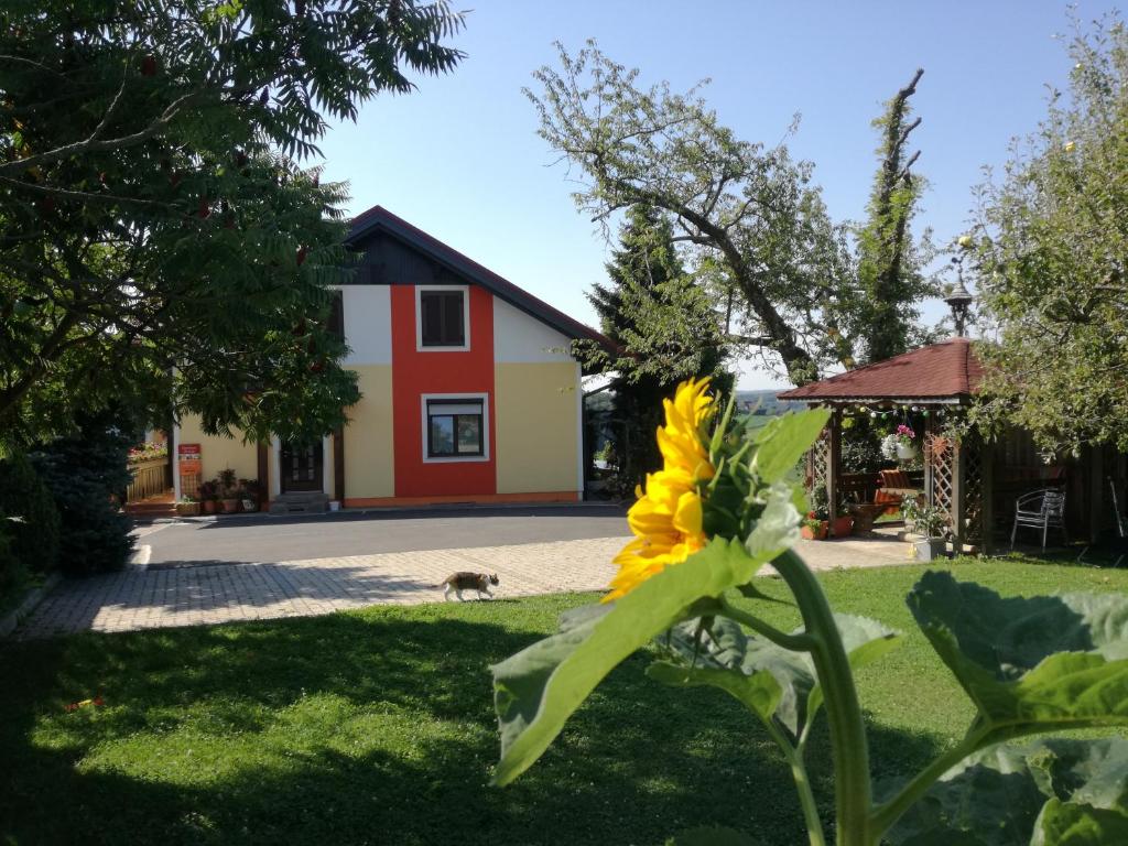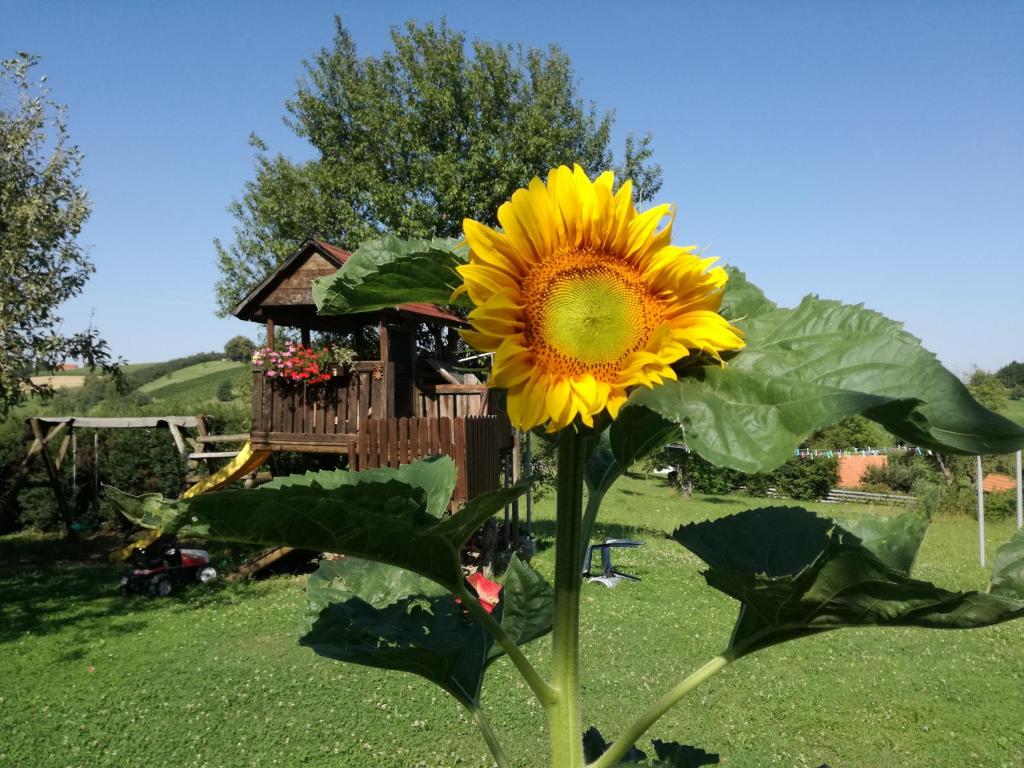 Unser Haus hat eine einzigartige Lage. Auf der Spitze eines Hügels mit herrlichem Rundumblick in die hügelige, steirische Landschaft. Sehr viel Ruhe kann man bei uns genießen, da keine Straße am Haus vorbei geht. Auch die Sonne kann man auf unseren Terassen von morgens bis zum Sonnenuntergang genießen. Unseren Garten schmücken unzählige Blumen und Rosen, für jede Jahreszeit etwas dabei. Kinder können sorgenfrei spielen und unsere Haustiere, wie unser Hund "Bodi" oder unsere Katzen freuen sicht über Streicheleinheiten.