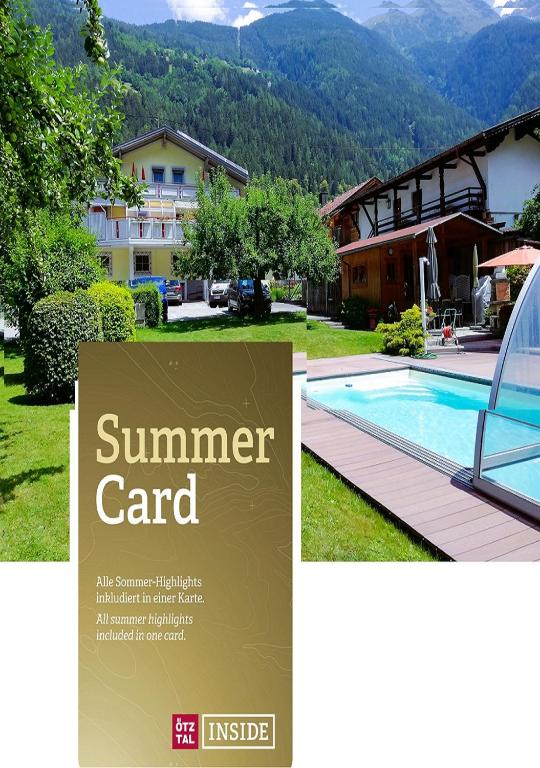 INCLUSIVE Ötztal Premium Card im Sommer von Anfang Juni bis Anfang Oktober Bei uns erhalten Sie bereits ab dem Tag nach der Anreise die Ötztal Premium Card. Sie können alle Höhepunkte des Tales (nach Öffnungszeiten) kostenlos oder verbilligt nutzen. °Sommerbergbahnen und öffentliche Verkehrsmittel °Aqua Dome -Tirol Therme Längenfeld °Area 47 - Outdoor Playground °Schwimmbäder, Badeseen, Hallenbad °Ötztaler Museen u.v.m.