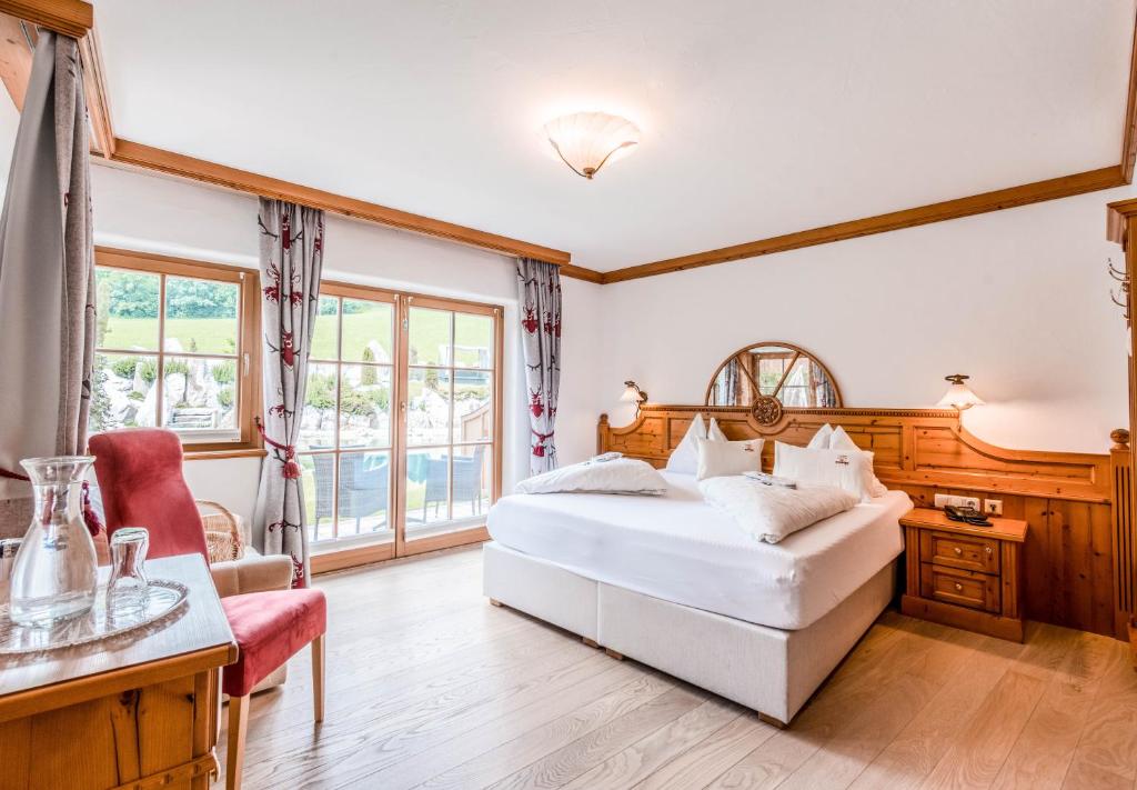 Die im Tiroler Stil eingerichteten Zimmer sind mit einem Sitzbereich und einem eigenen Bad mit einer Dusche ausgestattet. Die meisten Zimmer bieten einen Balkon.