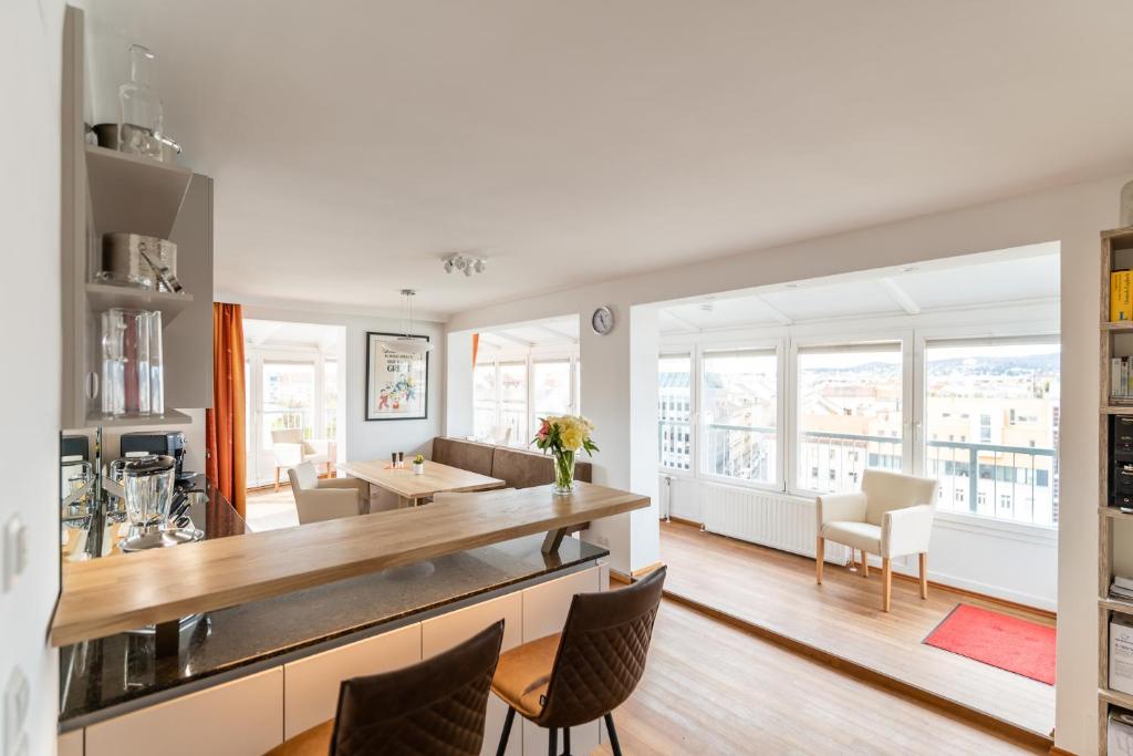 Das "Belle View" Apartement von Skyflats Vienna liegt am Hernalser Gürtel mit herrlichem Blick über das Westende von Wien, Wienerwald, Wilhelminenberg, Kahlenberg und Leopoldsberg. Auf der anderen Seite kann man direkt ins Stadtzentrum blicken, mit Votivkirche, Stephansturm und UNO-City. Das Apartment bietet viel Komfort, zwei Terrassen, eine Panoramagalerie, zwei Schlafzimmer, ein Badezimmer mit Dampfdusche und Extra-WC sowie einen Office-Bereich.